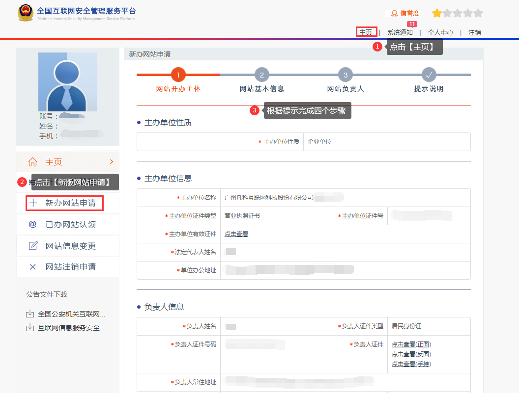 对于进行公安部备案的用户,首先必须填写主办单位及负责人的真实有效信息,只有提交了主体信息后,才能在该主体下进行网站备案。
