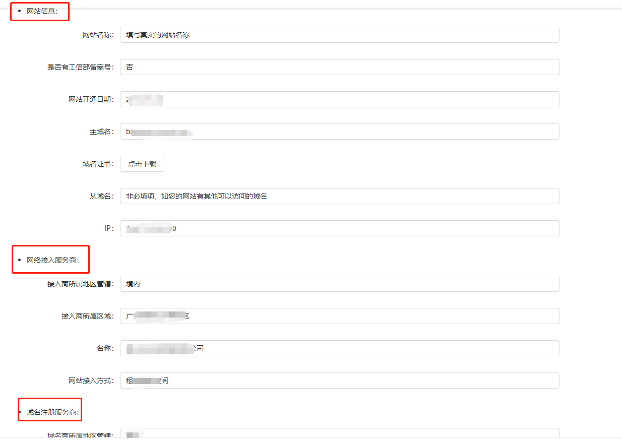 网站信息、网络接入服务商信息请按照域名管理-公安部备案-查询公安备案信息页面显示的内容填写
