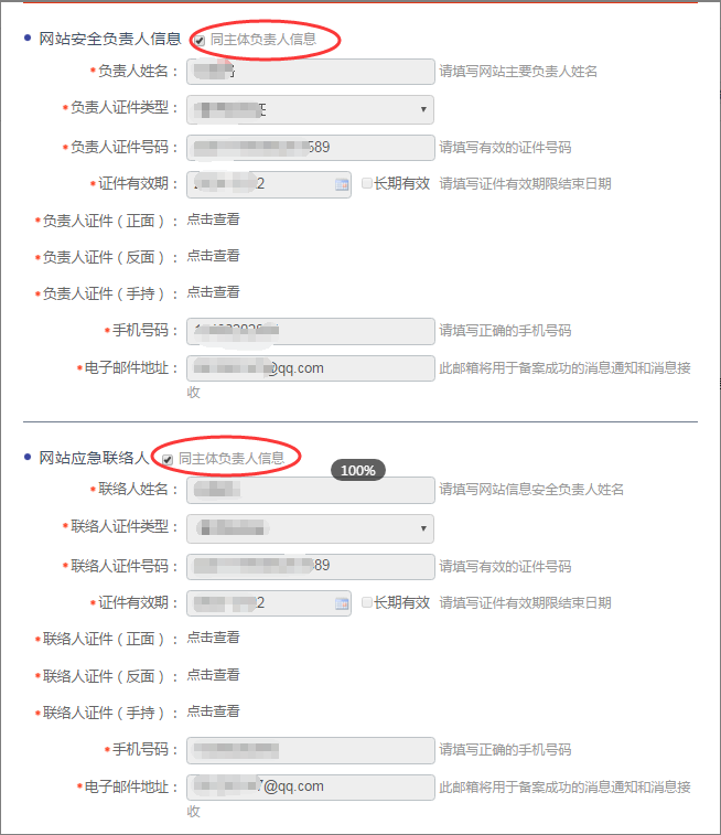 网站安全负责人/网站应急联络人可与主体负责人信息相同,直接勾选即可自动拉取主体负责人的信息。