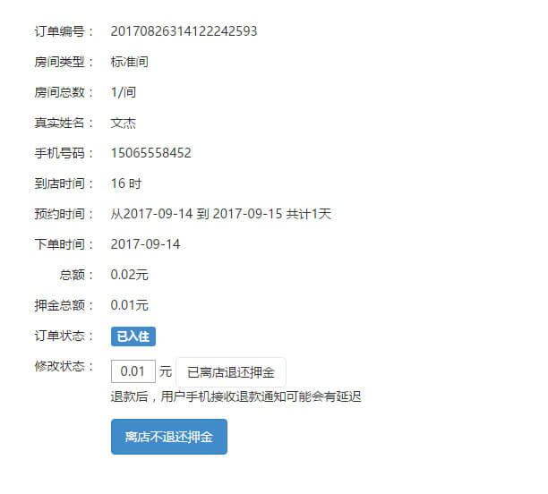 后台支持一键入住,一键退款、退押金、钟点房。支持微信支付、模板消息。客服实时收到新的订单信息,可以在手机端处理订单,支持按日期维护房价和房间数量,支持到店付款。支持积分功能,完成订房后获得的积分可以兑换代金券或优惠券,支持无线打印机和短信,评价打分功能,会员等级功能,二维码核销,积分或特产商城,会员充值(开发中)。