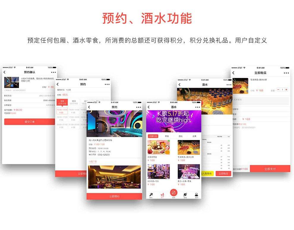 KTV微信小程序支持砍价、集卡、预约,商城。可预订任何包厢、酒水零食,所消费的总额可获得积分,积分兑换礼品,用户自定义;可以查看歌友发布的K歌信息,喜欢,评论,发布,互动交流...... 当前版本为连锁店版(商家手机端后台、店长手机端后台、服务生手机端后台)!