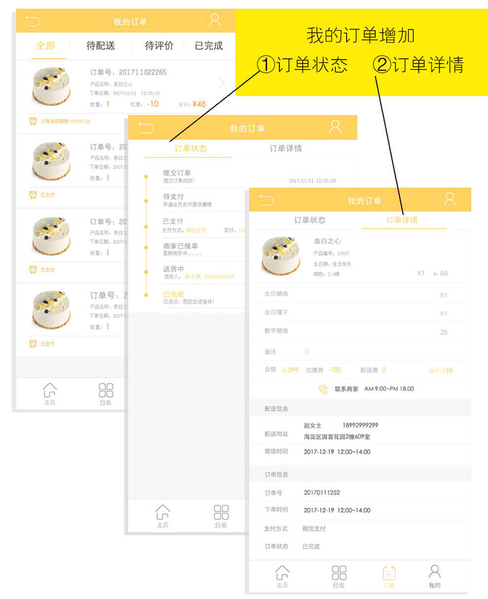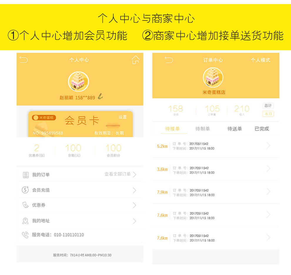 蛋糕订购,购物车,优惠卷,提醒系统,会员中心,商品展示(商品详情,推荐及商品评价),会员卡系统(充值,支付),商家手机处理订单(接单、送货),短信、模版消息,订单动态,订单自动打印,主题切换